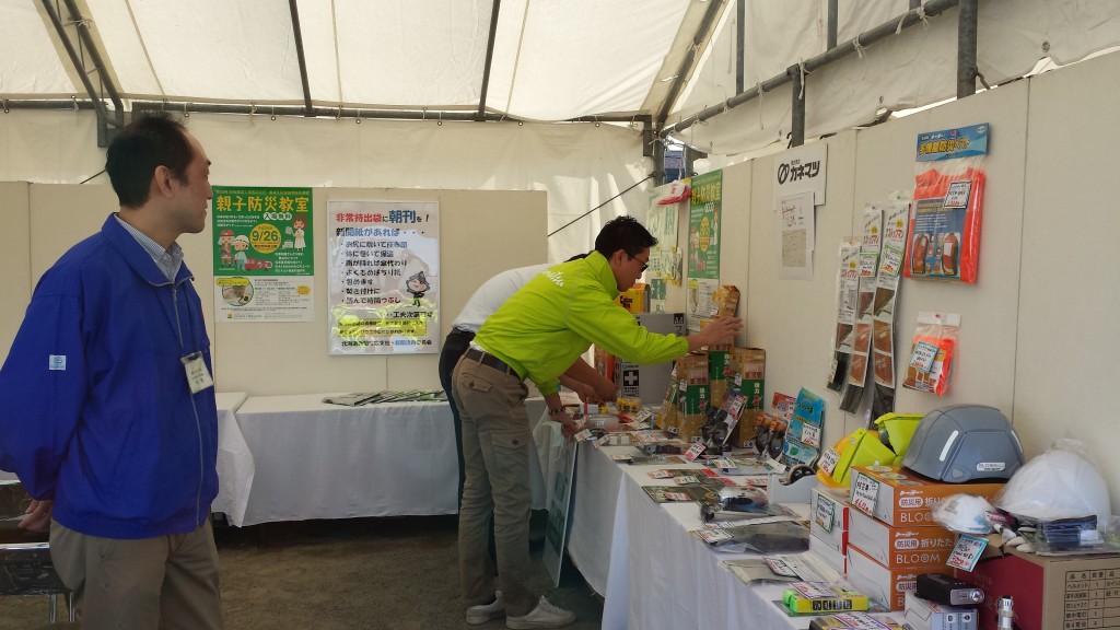 昨年までは当社スタッフが三々五々当日見学という形での参加でしたが、今年は特別にお声掛けいただいて 「防災グッズ」ブースでの出品で、実際に一日地域のみなさんに防災グッズをご案内させていただく という機会に恵まれました。このようなお話しをいただけて、ありがたく思っております。